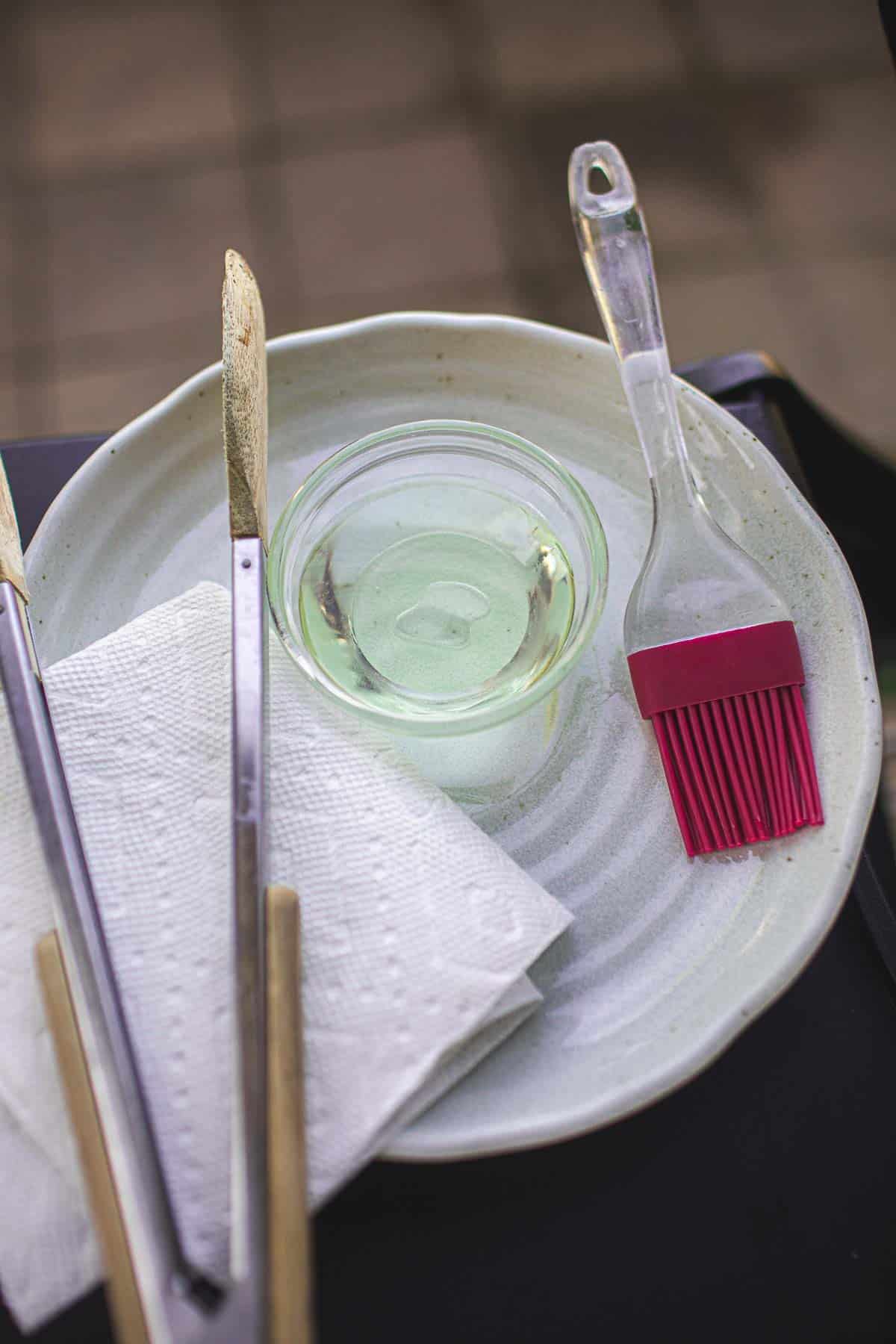 - Have a grilling set ready on the side. These are must-haves to help with the ease of grilling; tong, grilling brush, a small bowl of oil, paper towels, and a plate for the finished skewers.