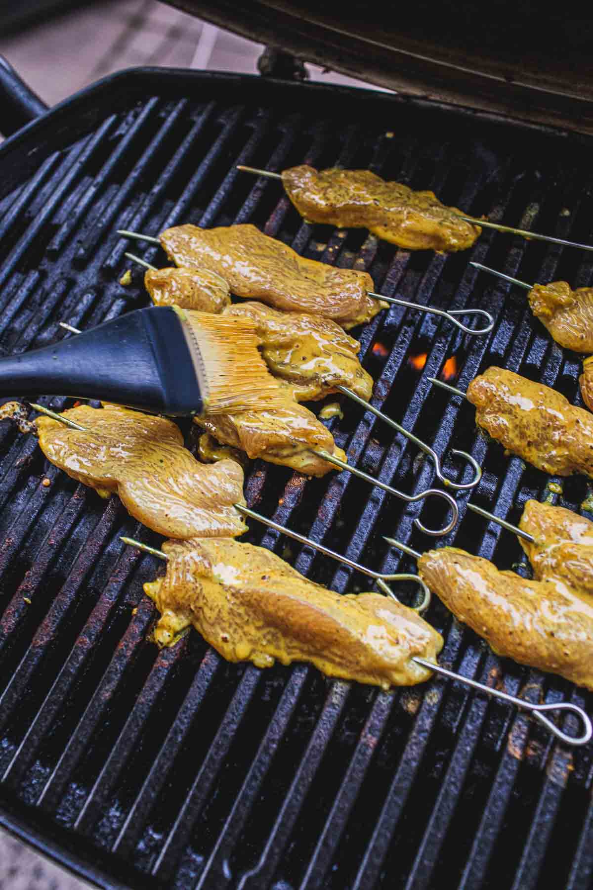 - Thread the meat on the skewers, and save the marinating sauce from brushing on when flipping the meat on the grill.