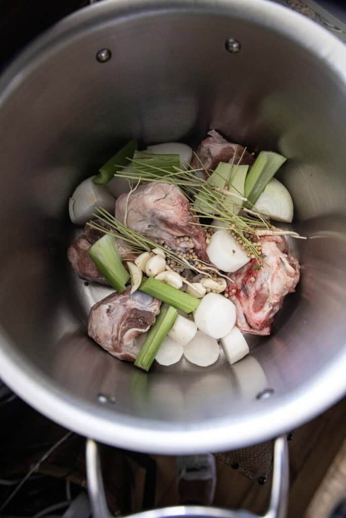 - Add aromatics and water. In a clean, large pot, add blanched bones, daikon, onion, celery, garlic, coriander seeds, white peppercorns, and cilantro roots. Pour in 18 cups of fresh water.