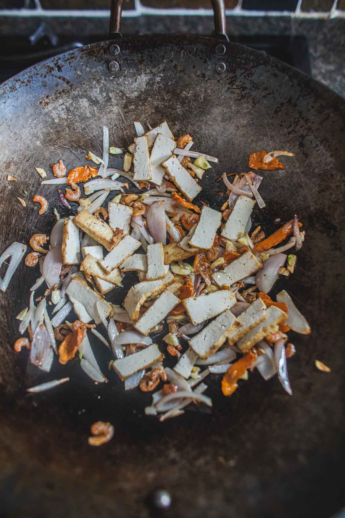 Step 3: Sauté the Aromatics. Heat a wok or large skillet over medium-high heat, adding oil once hot. Sauté garlic, shallots, dried shrimp, and pickled radish for 1-2 minutes until fragrant and lightly golden. Add the tofu and stir-fry briefly to crisp it up slightly.