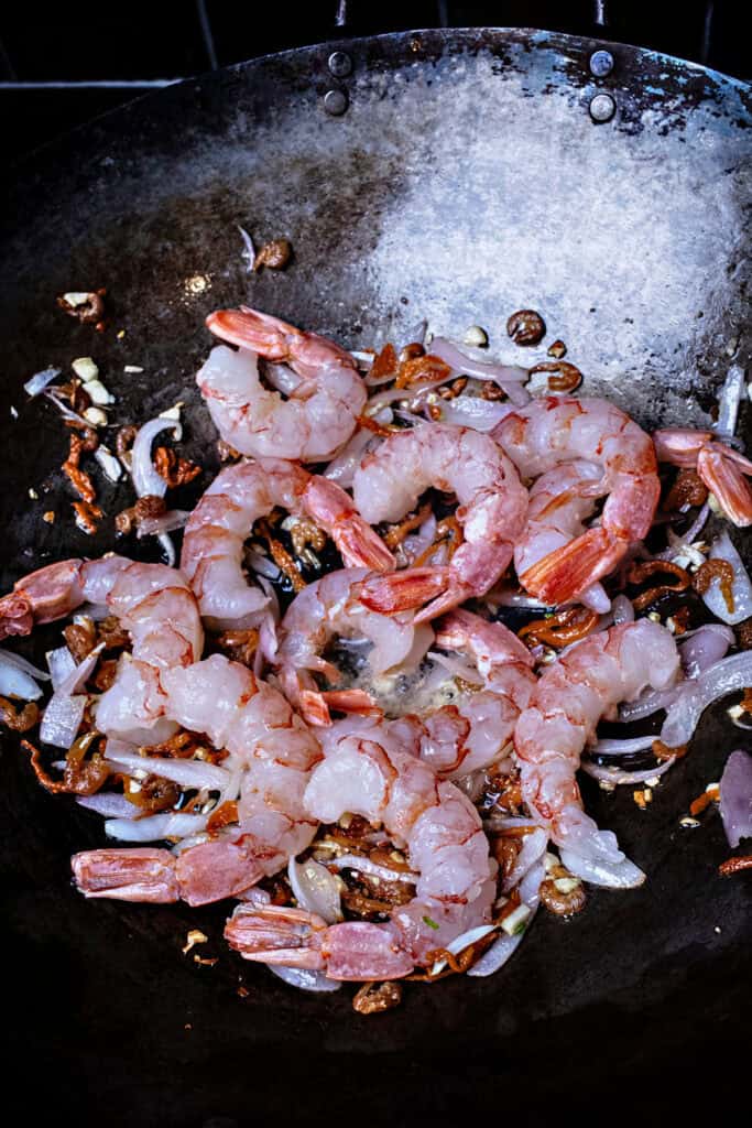 Step 4: Cook the Protein. Add the shrimp to the wok and cook for about 2 minutes until they turn pink. Move everything to one side of the wok, add more oil, and crack in the eggs. Lightly scramble them, let them cook until they’re just set, and keep them in chunky pieces to add texture.