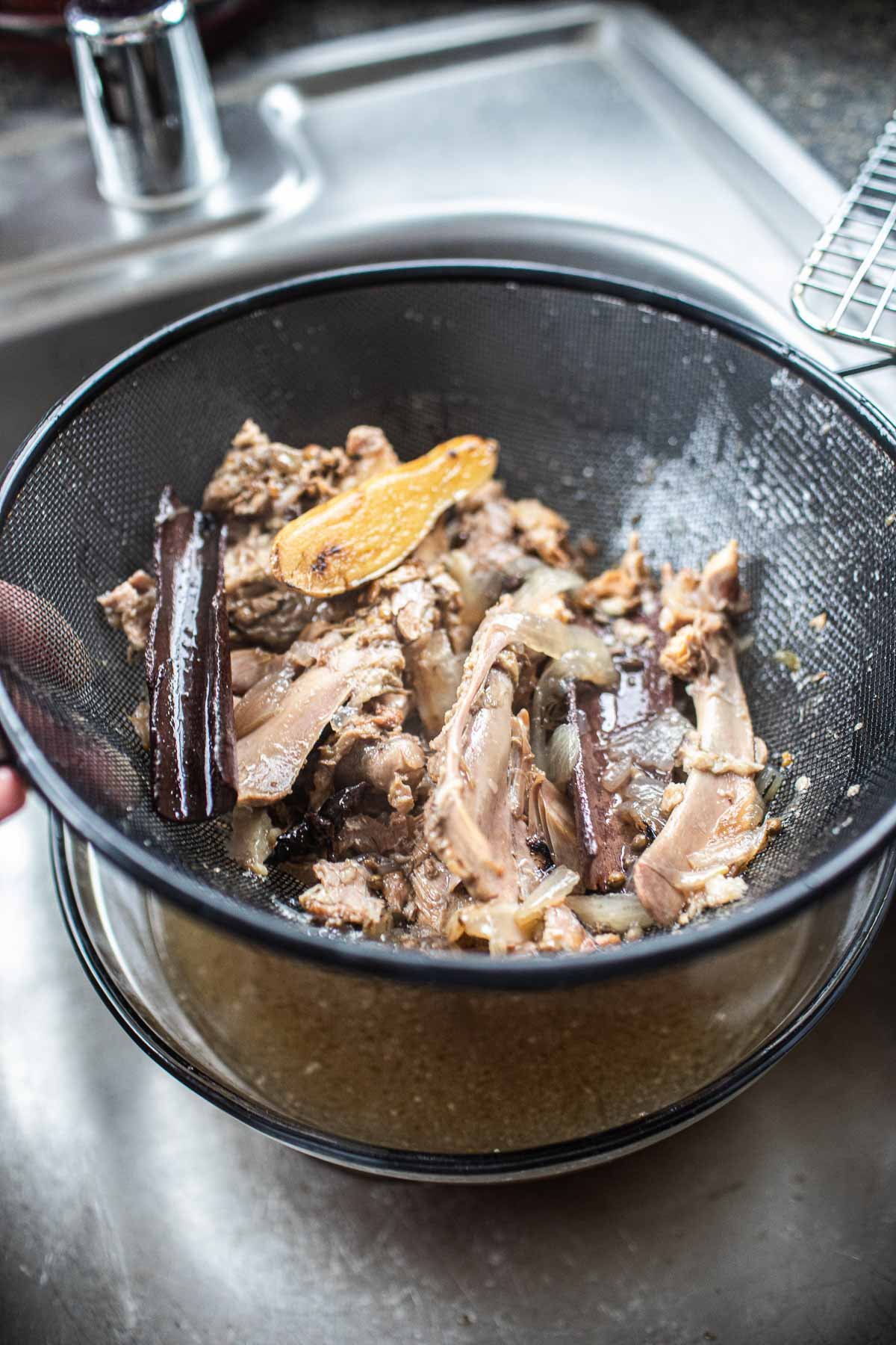 - Once the broth is cooled enough, place a large colander beneath a large bowl. Carefully pour and strain both. In the sink is the easiest and safest.